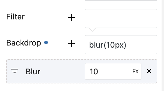 There are two ways to make glass effect. First is simple, it’s when you use backdrop-filter with blur + background with partial opacity. You can add it in Effect panel